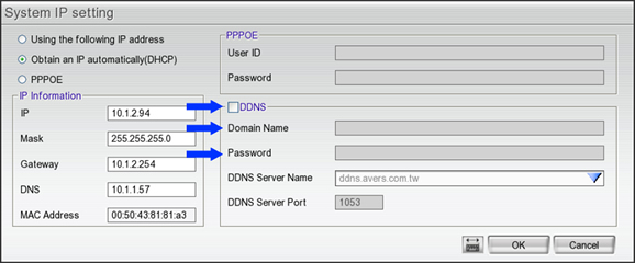 Vuelva a dirigirse a la sección Configuración > Red > Configuración principal, haga clic en Ajuste, y luego haga clic en la casilla de DDNS, ingrese el nombre completo de host/dominio (por ejemplo, mydvr.avers.com.tw), ingrese la contraseña y haga clic en Aceptar. Haga clic en Aceptar una vez más en la pantalla de Ajuste de red para aplicar los cambios.